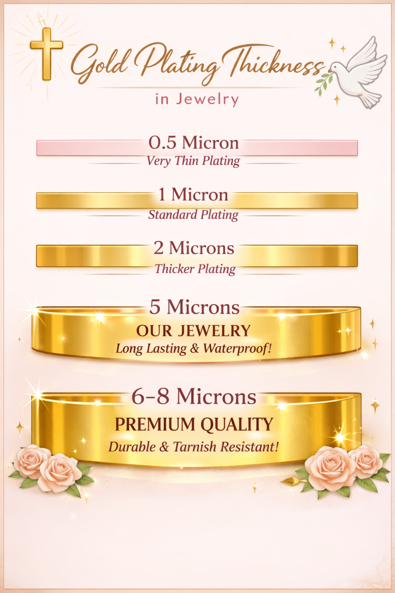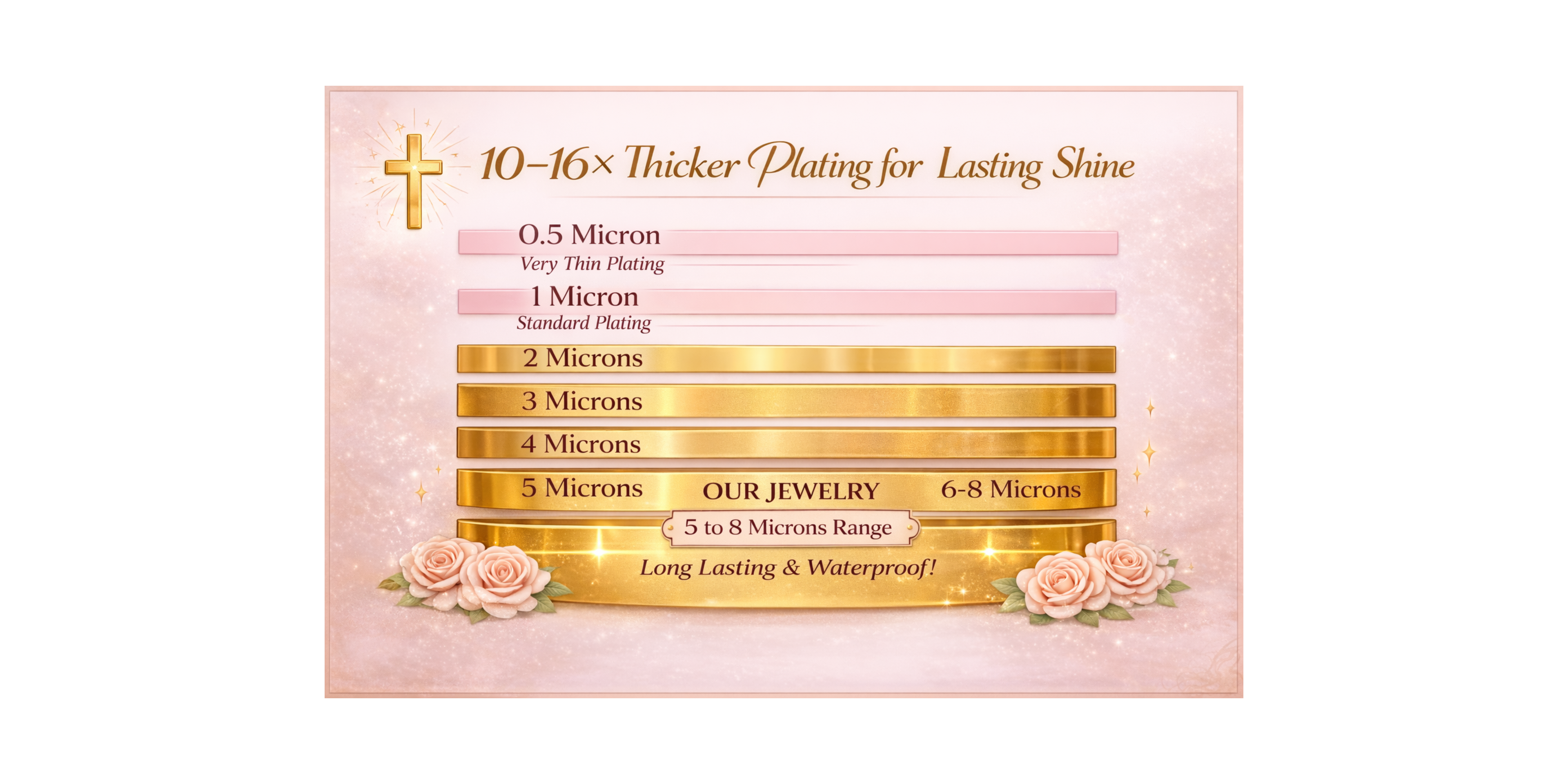 The thickness is specifically 5-8 microns, which is 10-16 times thicker than standard jewelry! This means it will not tarnish or fade over time, making our jewelry a great investment to your collection.